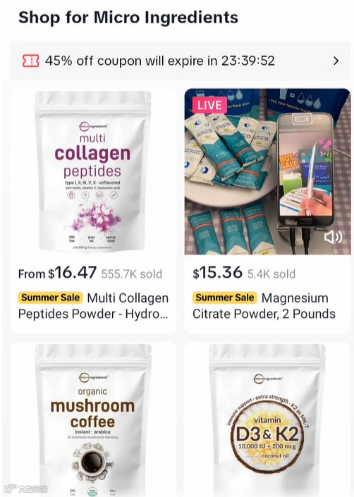 Micro Ingredients在TikTok Shop的售价要比其在官网的售价便宜一大截,通过优化商品列表和价格优势,吸引了大量消费者,再结合数据不断优化细节。