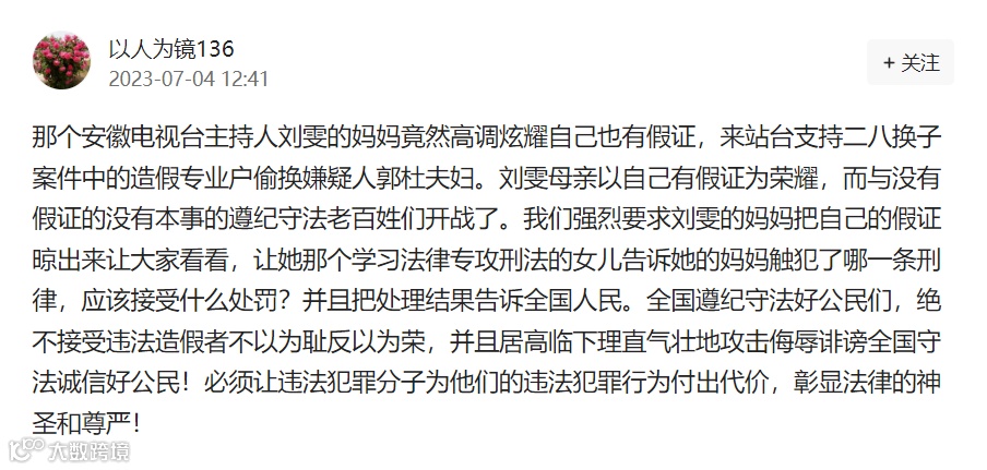 “刘雯”家族的另一个大V,她的母亲也开始下场,网名为“执着(刘雯母亲)”的网红孵化者此前在“二八换子”案中配合刘雯网暴当事一方引发争议(如下图),而在今日(2025年1月25日)发布的一则抖音中,她替女儿预告了当晚将在快手平台直播发布对北京互联网法院判决的“上诉书”,显然她们对于如何利用司法案件吸引流量,有着显而易见的经验与自信。