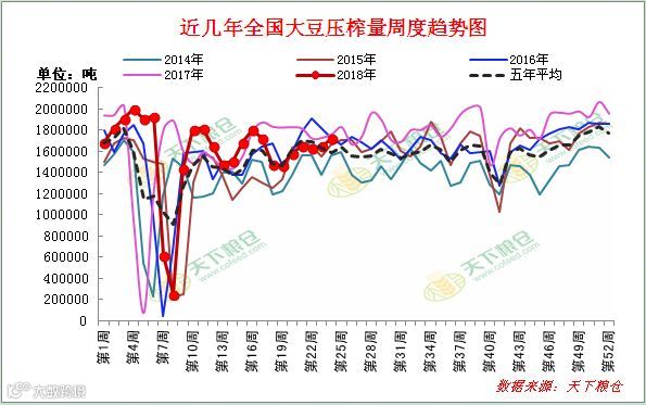 据估测,5-7月中国大豆进口量都将保持在1000万吨以上,由此也造成国内大豆库存高企。按照国家粮油信息中心此前估测的2017/18年度中国大豆进口量9600万吨推算,6-9月中国大豆进口量将达到3575万吨,较去年同期的3433万吨增加142万吨。