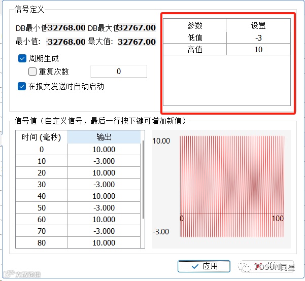 信号图形取决于此表中定义的参数,如图13所示,可进行修改低值,高值。