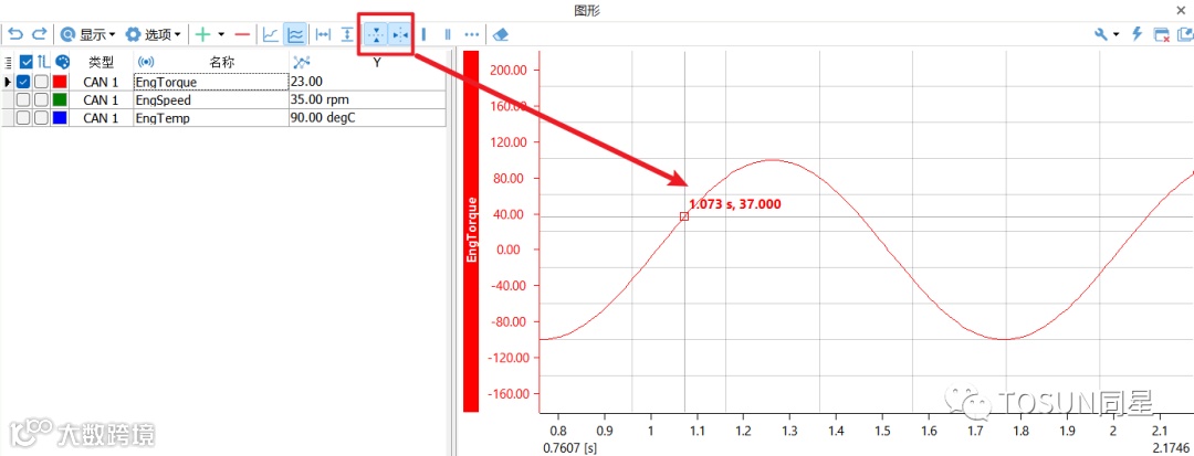 以EngTemp信号为例,对该信号执行仅显示鼠标选中信号操作,即使其他信号处于勾选状态,观测窗口也只会显示EngTemp信号的数据。