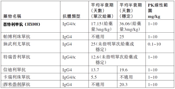 普特利单抗(HX008)为PD-1的人源化IgG4单抗,在IgG4的Fc区引入三重突变(S254T/V308P/N434A突变)以延长半衰期。一期临床中,单次给药半衰期为17-24天,稳定后半衰期为18-38天。