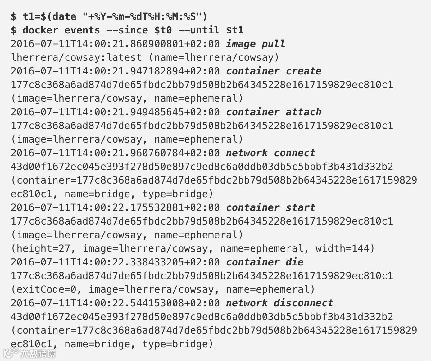 然后,运行“docker event”看看哪些事件会被记录下来: