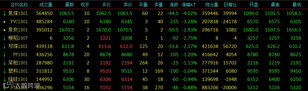 和讯期货消息 周二(10月31日)商品期货下跌居多,黑色系分化,焦煤跌幅扩大重挫超4%,盘中跌破五个月低点,焦炭跌近3%,郑煤跌逾2%,热卷和螺纹钢涨逾1%;有色金属强势,沪锌涨近3%,沪锌涨近2%;能化板块弱势,PVC跌逾3%,PP、塑料跌逾1%;农产品涨跌不一,玉米、大豆、棕榈等微红,菜粕跌超1%。