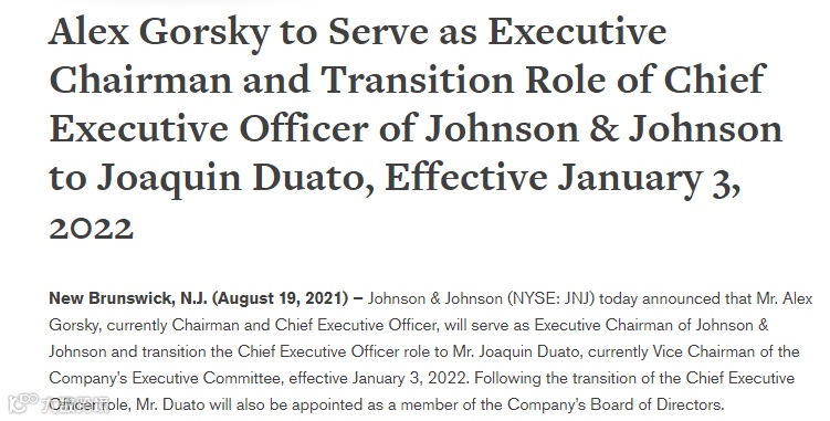 8月19日,强生官网显示,Alex Gorsky(亚历克斯-戈尔斯基)将于2022年1月3日卸任强生首席执行官(CEO)职位,仅担任执行董事长。执行委员会副主席Joaquin Duato将接替这一岗位,同时被任命为公司董事会成员。