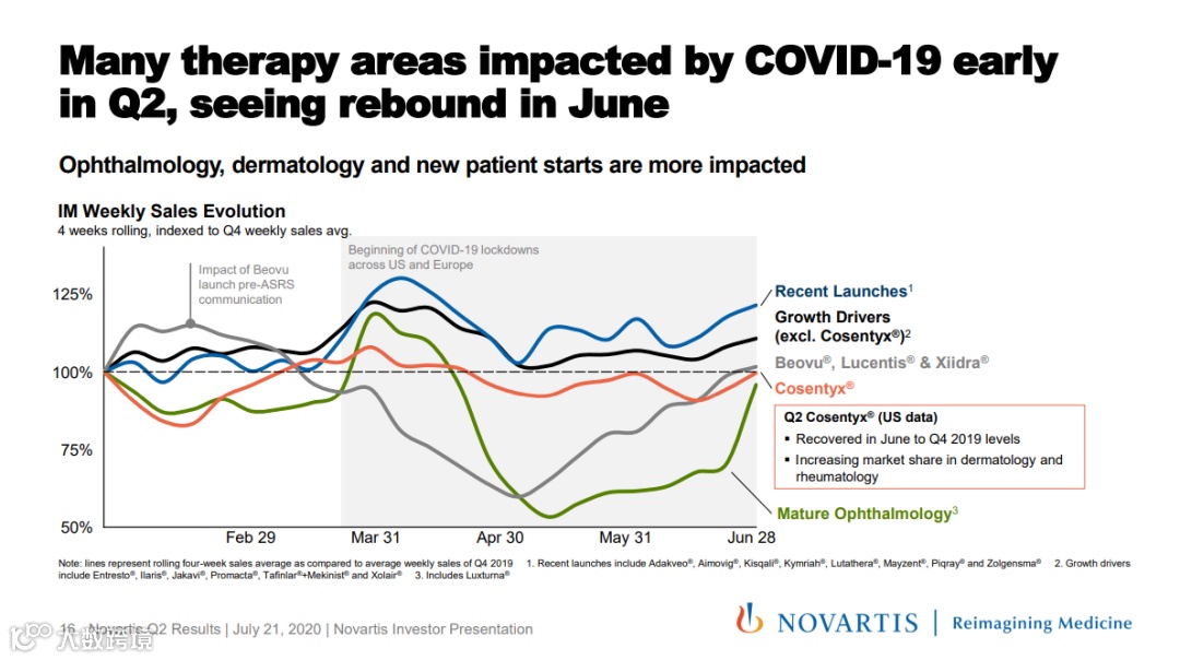 从2020Q2业绩表现来看,诺华众多产品受到COVID-19的影响,尤其是眼科药Beovu、Lucentis和Xiidra。其中,Lucentis在第2季度的销售额下滑了25%。另外,诺华成熟眼科业务销售收入下滑了32%。不过到了6月份,这些产品销量逐渐恢复正常。