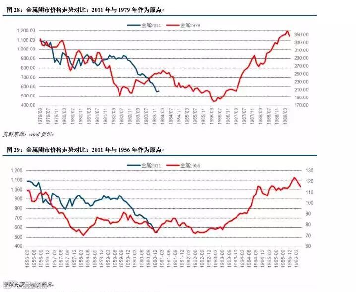 经过产能周期与超级周期的定位之后,我们可以对当前的2011年开始的大宗商品熊市进行一个性质的定位,显然,当前的商品熊市是超越了超级周期的,而更多的是一个产能周期级别的熊市。而从更短的超级周期来看,每轮超级周期的下跌一般都是在6到8年之间,所以,当前熊市的形态,基本可以类比1956年至1963年的熊市和1979年至1986年的熊市。而我们把1956年和1979年熊市进行了叠加,其走势具有惊人的相似性,所以,从技术走势上来看,这是完全可以参考的。因此,我们对2011年开始的本轮熊市与1956年熊市和1979年熊市分别进行叠加,得到如下图表。