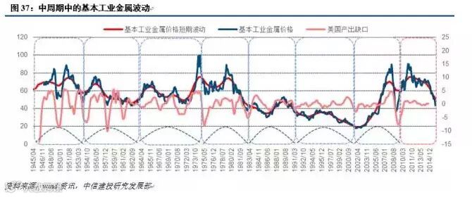 我们以金属价格与基本金属行业的固定资产平均使用时间进行了对比,发现了非常显著的反相关特征,也发现了明显的基本金属的产能周期。从数据可得的1947年之后,综合我们对大宗商品周期的理解,我们认为此种方法划分的固定资产平均使用时间产能周期可以划分为两个大的周期。以固定资产平均使用时间为基准,第一周期从1956年开始回升,经历1962年和1972年两个头部之后,在1972年达到高点,这一上升期历时16年,随后下降期至1980年结束,历时8年,总的周期自1956年到1980年,历时24年。第二周期从1980年开始回升,一直上升至2004年,历时24年,而从2004年开始下降目前看2014应该是一个新低位置,下降期历时10年。总的周期历时34年。而在这个过程中,商品价格也有对应的变化,如表4。目前的问题在于1956年至1972年的产能下降阶段出现了双头结构,似乎在划分上存在疑义。但我们在参考了石油的产能周期后,认为这样划分是合适的。