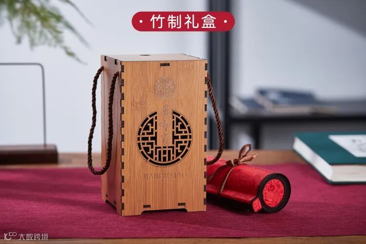 ▲采用朱红绸布卷轴,以团圆纹暗花绸装裱,精致大气。