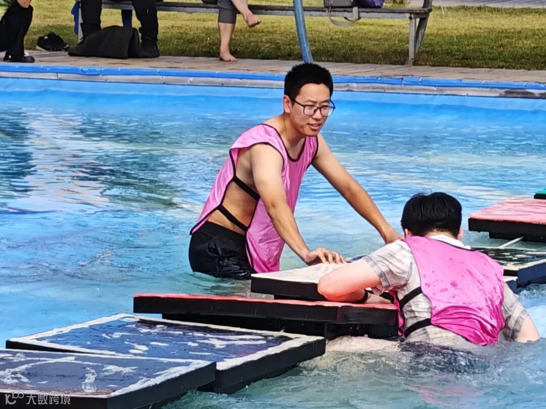 分组环节,大家自发组队,10人一组迅速确定分工。随着一声令下,冲关正式开始:有人身手敏捷,快速跃过浮板;有人小心翼翼保持平衡,队友则在一旁挥手鼓劲;前一名队员冲过终点,下一名队员立刻接棒,整个过程衔接流畅。飞溅的水花打湿了衣衫,却挡不住大家的热情,冲关成功时的集体欢呼,让 “协同作战” 的信念深深扎根。