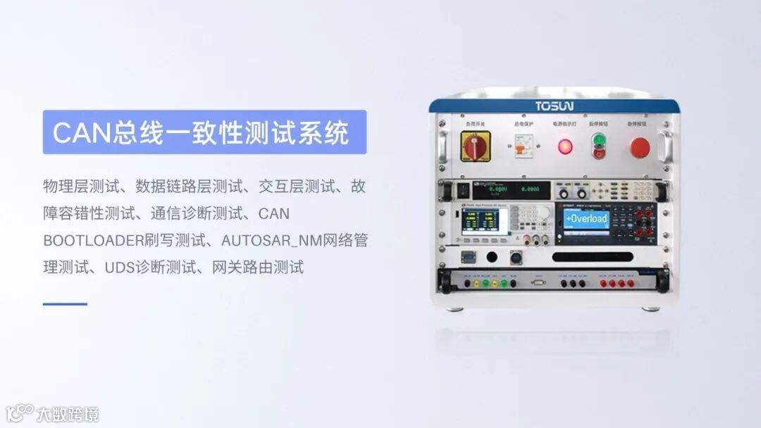 CAN FD/CAN总线一致性测试系统,在硬件系统上基于同星自主研发的总线分析工具,干扰仪,一致性测试机箱,并搭配程控电源,示波器,数字万用表等标准外围仪器设备;在软件上基于TSMaster编写测试脚本实现规范要求的测试逻辑,通过对硬件系统的程控调用,可自动化完成汽车零部件CAN FD/CAN节点物理层、链路层及应用层(网络管理、UDS诊断、刷写、路由)的一致性测试,并生成定制化格式的测试分析报告。