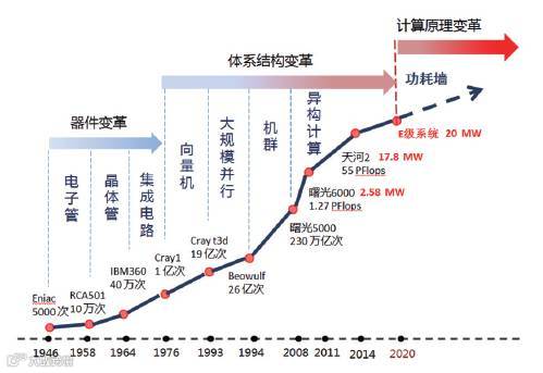 自第一台电子计算机ENIAC问世以来,以电子器件、系统结构和计算模式的重大变革为标志,高性能计算机发展已经历经三次大的发展阶段(图4)。