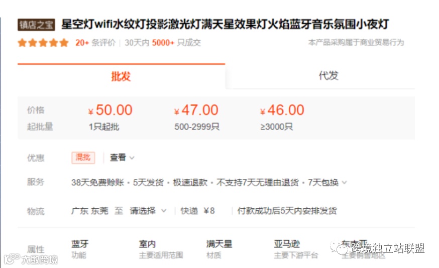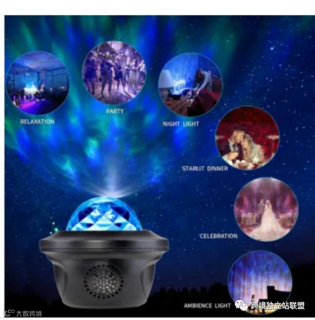 房间投影灯:可将梦幻灯光效果投射至整个房间,支持多色选择,营造浪漫氛围。独立站售价59.95美元,1688同款批发价50元人民币。