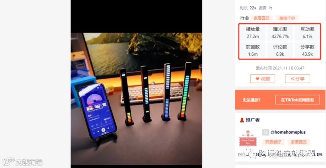 RGB节奏识别灯:支持根据环境音律变换灯光颜色,具备9种显示模式、8种颜色模式及3种音频识别模式。适用家庭、汽车、派对、游戏室、卧室及户外等多种场景。TikTok相关视频播放量达2720万,获160万点赞,分享次数超4.3万。Shopify独立站售价19.99美元,1688同款批发价13.8元人民币。