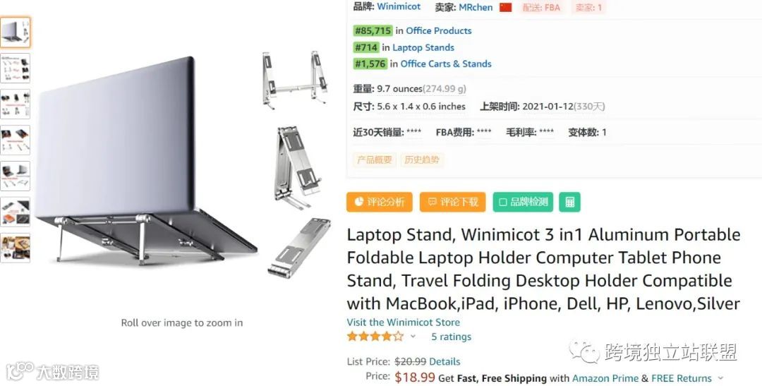 便携式手机支架:兼容手机、平板与笔记本电脑,支持折叠收纳,便于随身携带。产品配备防滑硅胶垫,稳定性强,四面通风设计有助于散热。相关TikTok视频播放量达640万,获35万点赞,曝光率提升11985%。亚马逊售价18.9美元,1688同款批发价约15元人民币。