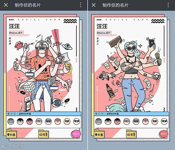 这是猫眼娱乐出品的一支宣传类H5。亮点在于紧跟当下热议的“社会人”议题,围绕“制作你的 social 名片”为主题进行H5的设计和制作。跟之前出现的用户DIY各种图片有异曲同工之妙,比较适合朋友圈传播。