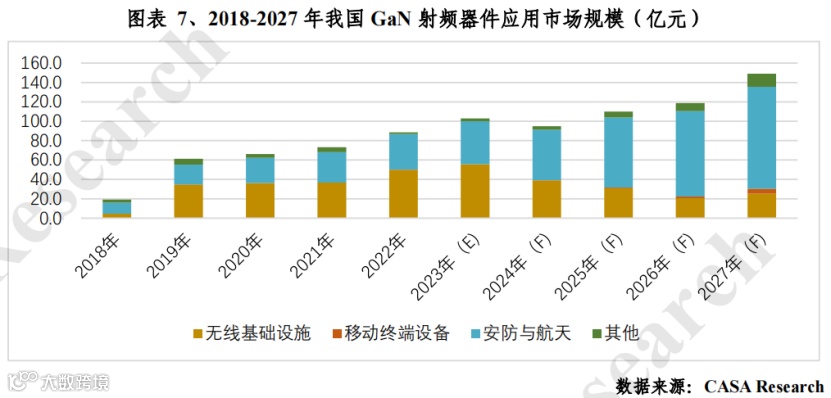 截至2023年底,我国5G基站总数达337.7万个,较2022年增加106万个。据此测算,2023年国内GaN射频器件模组市场规模为102.9亿元,较2022年同比增长16.2%。其中,无线基础设施是带动GaN射频电子市场增长的主要驱动力,市场规模约为59亿元,整体市场占比达57.3%;非民用的国防与航天应用 2023 年整体市场占比约 42.7%,其他为射频能量、卫星通信等市场。
