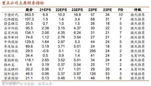 投资建议。推荐或关注三元电池:宁德时代、亿纬锂能、蔚蓝锂芯、孚能科技、欣旺达(电子)、国轩高科;三元正极:当升科技、容百科技、振华新材、厦钨新能(有色)、长远锂科;三元前驱体:中伟股份(有色)、华友钴业(有色)、格林美(有色)、芳源股份(有色)。