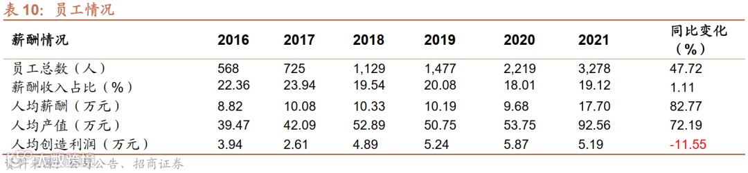 经营上看,公司2021年员工规模从2219人激增到3278人,人均产值从53.8万元大幅提升到92.6万元,赶超科达利等同行企业水平;同期,公司人均薪酬从9.7万元激增到17.7万元,薪酬收入比提升1个百分点达到19.1%,公司员工也较好分享了经营成果。