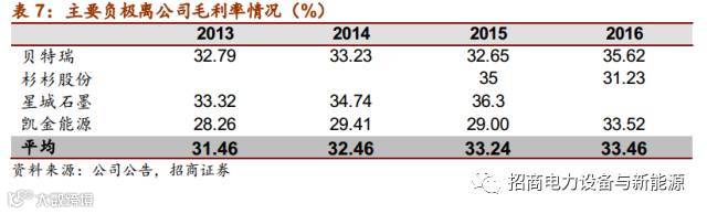 负极材料总体供需结构基本平衡,竞争格局比较稳定:近几年,负极材料需求快速增长,产能利用率逐年上升,2016年负极材料行业产能利用率在80%左右,供需结构总体平衡。其市场格局也比较稳定,2016年负极材料中,贝特瑞、杉杉股份、江西紫宸合计占比近60%。人造石墨市场上,杉杉股份和江西紫宸共同占有约40%的市场份额,天然石墨市场贝特瑞占比50%多。
