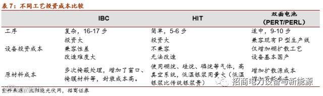 理论上来说N型电池优势明显:与传统的P型单晶电池和P型多晶电池相比,N型电池有光电转换效率高、温度系数低、光衰减系数低、弱光响应等,具备较大的效率提升空间和潜力,是高效电池技术路线的必然选择,且随着PERX、IBC、HIT等电池新技术的引入,N型单晶电池的效率优势愈加显著。(见表3)