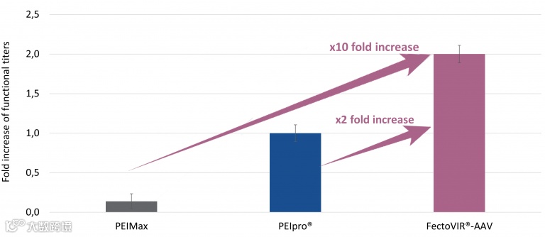 与PEIpro®和其他竞争对手相比,FectoVIR-AAV® 在悬浮细胞中能生产更高滴度的rAAV病毒载体。与其他竞争对手(PEImax)相比,FectoVIR-AAV®可重复性地大幅提高 AAV 产量,可高达10 倍(Fig. 1)。