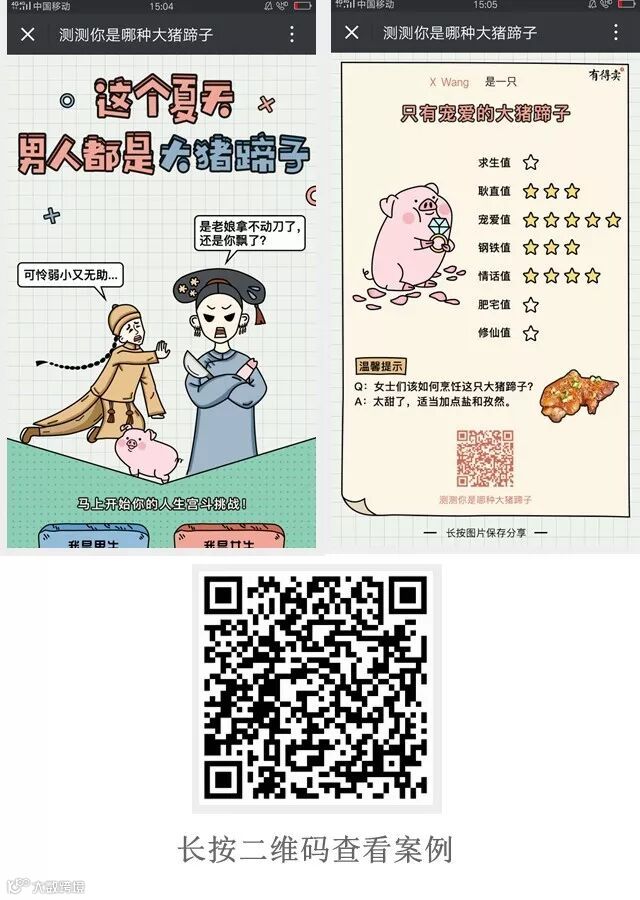 策划上,问答题的形式,答题之前需要先选择性别,但性别与题目的设置并无关系。一共7道题,回答完毕后会出现结果页,结果页列出了男友的求生值、耿直值、宠爱值等7个角度的评星,用户可以选择再测一次或一键回收大猪蹄子。