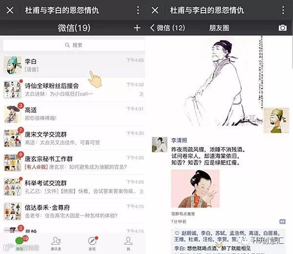技术上采用了视频技术,然后模仿微信群聊和朋友圈等操作。首先进入页面是创意切入点“李白杜甫感情不和”,然后通过微信群聊朋友圈等内容展示两人矛盾加深。在微信对话和朋友圈操作上设置交互,给用户营造一种是自己在参与故事的感觉。