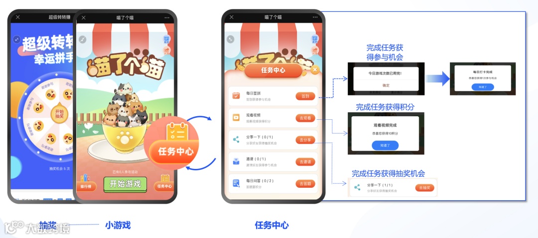 在线下门店活动中可以通过抽奖、小游戏+任务中心的组合玩法,完成任务获取积分、参与机会或者抽奖机会的方式,激发用户兴趣,提升用户活跃度以及停留时长。