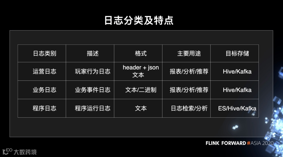 业务日志记录的是玩家行为以外的业务事件,这个就比较广泛,比如 Nginx access log、CDN 下载日志等等,这些完全没有固定格式,可能是二进制也可能是文本。主要用途类似于运营日志,但更加丰富和定制化。