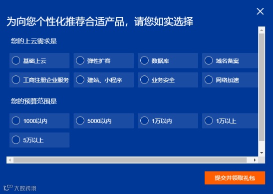 领取大礼包页面填写自己的业务需求和预算,商品个性化推荐; -