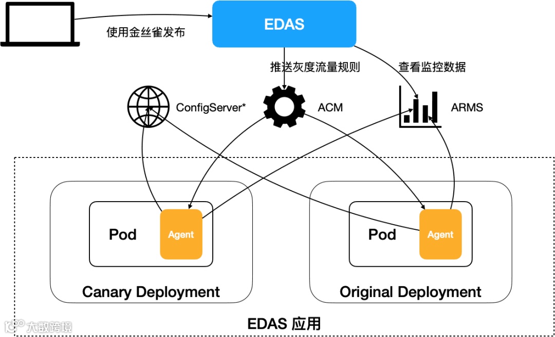 这里简要列出了EDAS金丝雀发布的重要步骤和参与的组件,可看到一些云产品参与了金丝雀发布的过程,其中ACM用来推送灰度流量规则,ARMS负责采集并呈现监控数据,运行于用户侧的Agent则保证了程序可在用户完全无感知下,按照灰度的规则进行服务注册和数据上报:
