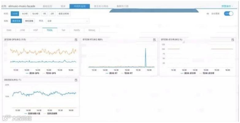 前面两种类型的监控已经基本可以定位到故障是否由于程序 Bug、上游应用或单机故障引起的,还有一类就是对中间件的监控,这里我们利用了 Sunfire 的基础监控对应用的 CPU、Load、JVM、HSF(Dubbo)、MetaQ 等中间件的各项指标进行监控。如果因为中间件故障,此处将会有明显的报警。