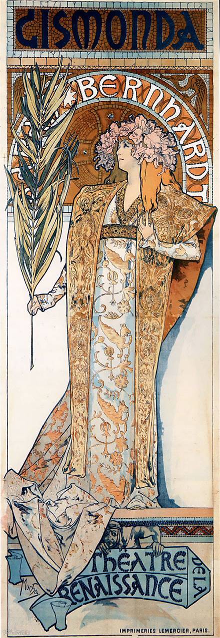 慕夏是在34岁时,为法国女演员Sarah Bernhardt的舞台剧《Gismonda》制作海报而一举成名的~
