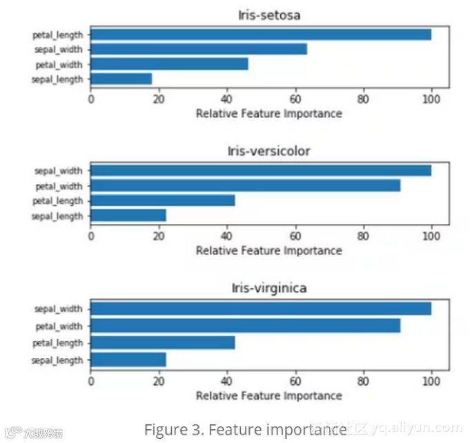 表1给出了三种植物中每个自变量系数的估计。显而易见,花瓣的长度和宽度是特征描述过程中最重要的变量。因此,在每个物种的特征重要性图中强调了这两个变量(图3)。