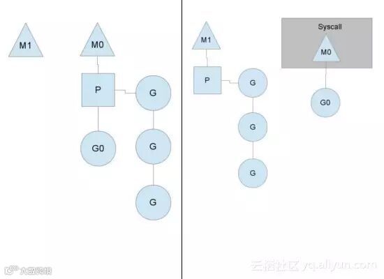 当正在运行的goroutine阻塞的时候,例如进行系统调用,会再创建一个系统线程(M1),当前的M线程放弃了它的Processor,P转到新的线程中去运行。
