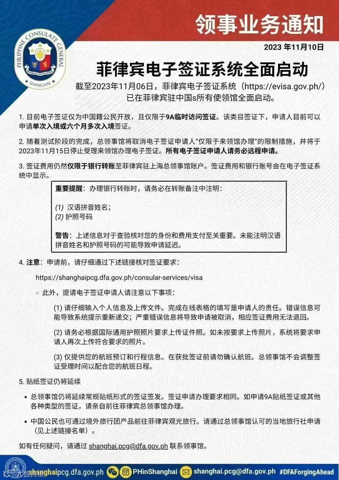 8月24日起,菲律宾外交部上线菲律宾电子签,但仅在菲律宾驻上海总领事馆进行试点,且个人不能自行线上申请,需到达上海总领馆并在工作人员的指引下使用电子签系统申请。