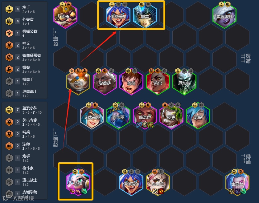 所以反治,金克丝的方法即为,前排最边角的两个位置选择不站弈子,因为攻击角度问题,金克丝w的命中方向将会向图中娜美伊泽的方向延伸;而作为蓝发进攻方的金克丝如果遇到对方边角前排没站人可选择站在最后一排图中圈起的位置去对角眩晕敌方主C