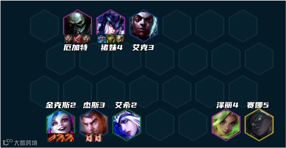 3-2拉6,小D一波找2星金克斯,补人口上提莫挂重伤开3约德尔,或者直接上杰斯都行。然后在6人口慢D三星金克斯,其他卡只要追2星即可,后面都会换的。