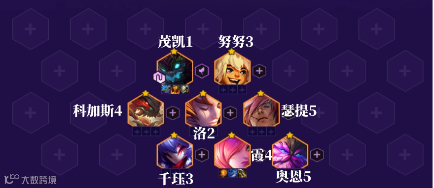 阵容组成:茂凯、努努、科加斯、洛、瑟提、千珏、霞、奥恩