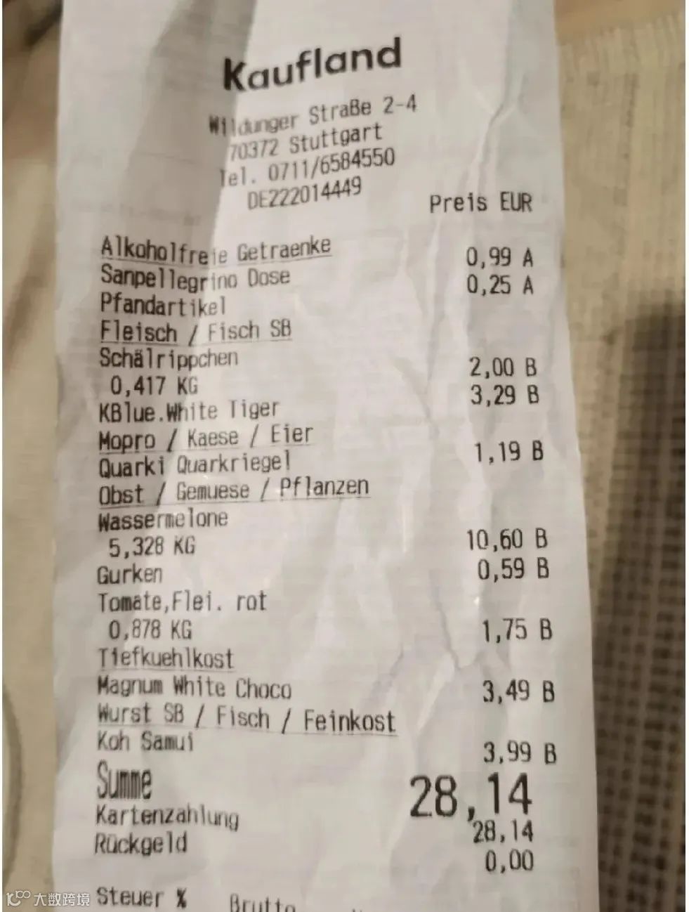 “德国西瓜好贵,买了28的东西,居然10欧都是瓜钱,一个西瓜够买四斤排骨。”