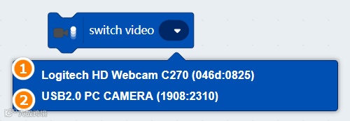 切换摄像头积木块,如果你电脑已经插上多个摄像头,点击下拉菜单,可以有多个选择。