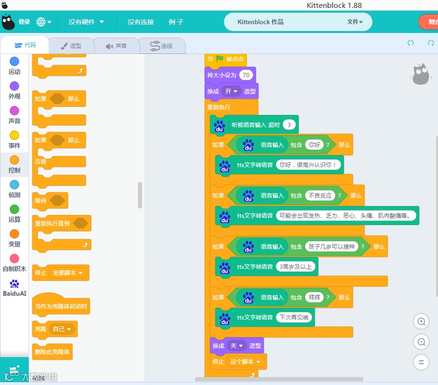 师:接种疫苗是防控新冠疫情最有效的手段,但接种疫苗点咨询的人非常多,有时工作人员不能及时回复每个人,面对这样的情况,我们可以怎么做呢?(生:要是有个智能回复的机器就好了,可以提高工作效率)那就让我们一起创建一个小卫智能音箱,及时回复每一位咨询者的疑惑吧!