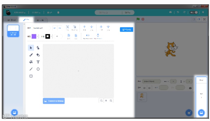 造型标签用于修改舞台的角色或者舞台背景。(如果你用Kittenblock只是用来学习硬件编程,一般用不到,不需了解)下图当选择舞台角色,显示的效果