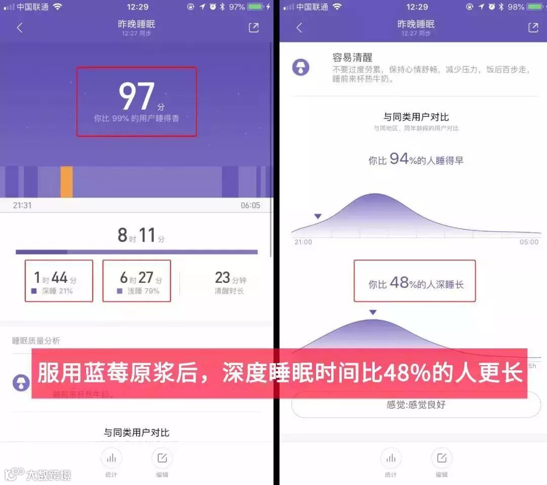 用户马女士发来睡眠监测数据,也让我们感到欣慰:服用一段时间后,睡眠状况改善,深度睡眠时间比一半的人都长!一夜无梦睡到天亮!