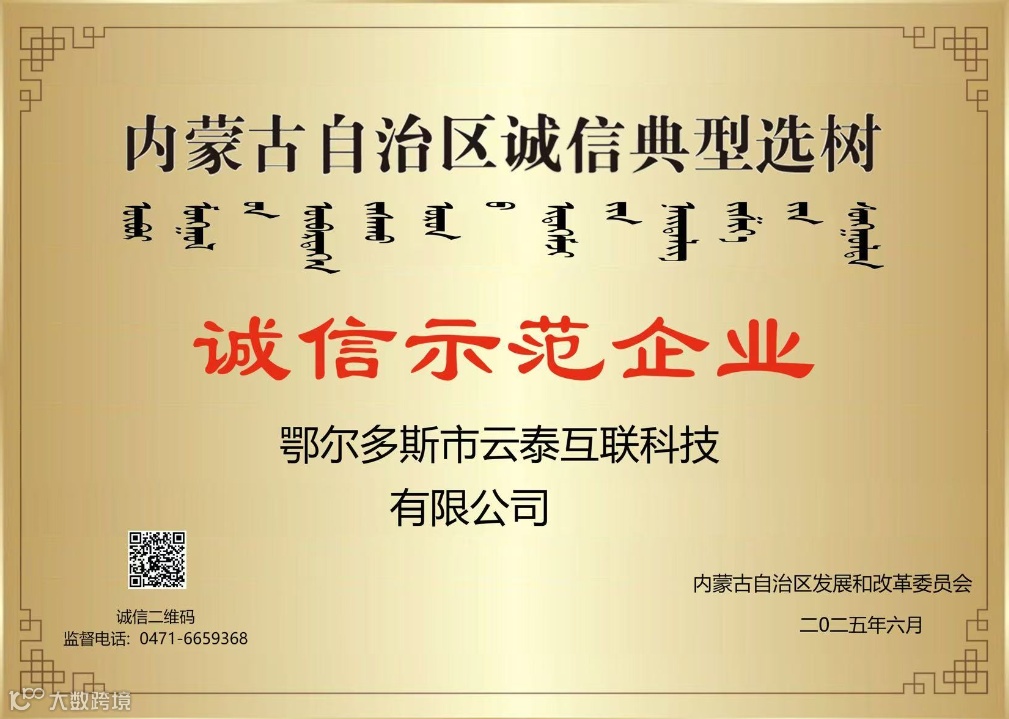 近日,在行业主管部门组织开展的企业信用体系建设评选中, 云泰互联凭借长期以来在守法经营、诚信履约、服务规范、社会责任等方面的突出表现,成功获评 “内蒙古自治区诚信示范企业” 荣誉称号!