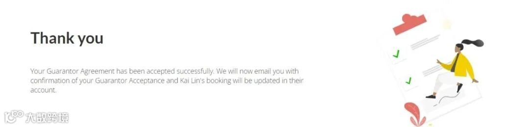 到此,担保人部分就全部完成啦,你会跳到完成界面,并在稍后一段时间收到guarantor acceptance的邮件,你dashboard中的担保人绿钩也会亮起。