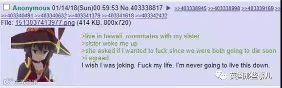 “我住在夏威夷,跟我姐一起。姐突然把我叫醒,我她说反正我们俩都要死了,要不要最后打一炮,我同意了。她长得挺好看的,是我亲姐,我不会把她照片放上来的,你们这些看热闹不嫌事大的人!我们说好了要保密,但是那事之后,我们都没怎么讲话。我现在感觉糟透了,又恐惧,又内疚。是的,我还高潮了,整个过程中,我还哭得像个傻逼,我还不想死。特么的怎么连导弹警报都会搞错。我的人生玩完了。这个阴影这辈子都甩不掉了。她27,我22,以前我很尊敬她,现在只感觉可怕。”