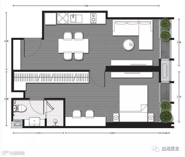 ▲本次推出的诺尚枫景实际使用面积从27平米起,有Studio、一房和两房等户型。总价低,租金收益率较高。室内面积虽不大,但业主有充足的活动空间。