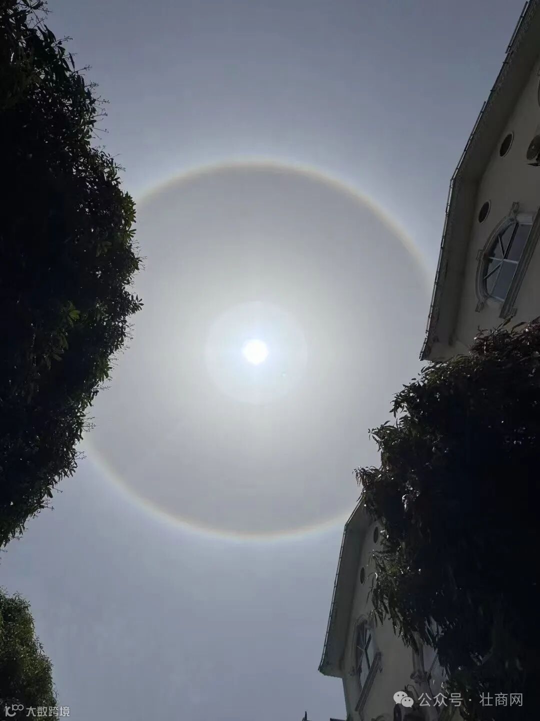 据了解,这种现象就是日晕。简单来说就是高空有卷层云,云里面的冰晶被太阳光折射,在太阳周围出现以太阳为中心、内红外紫的的彩色光环。冰晶含量越大,光环也就越显著。